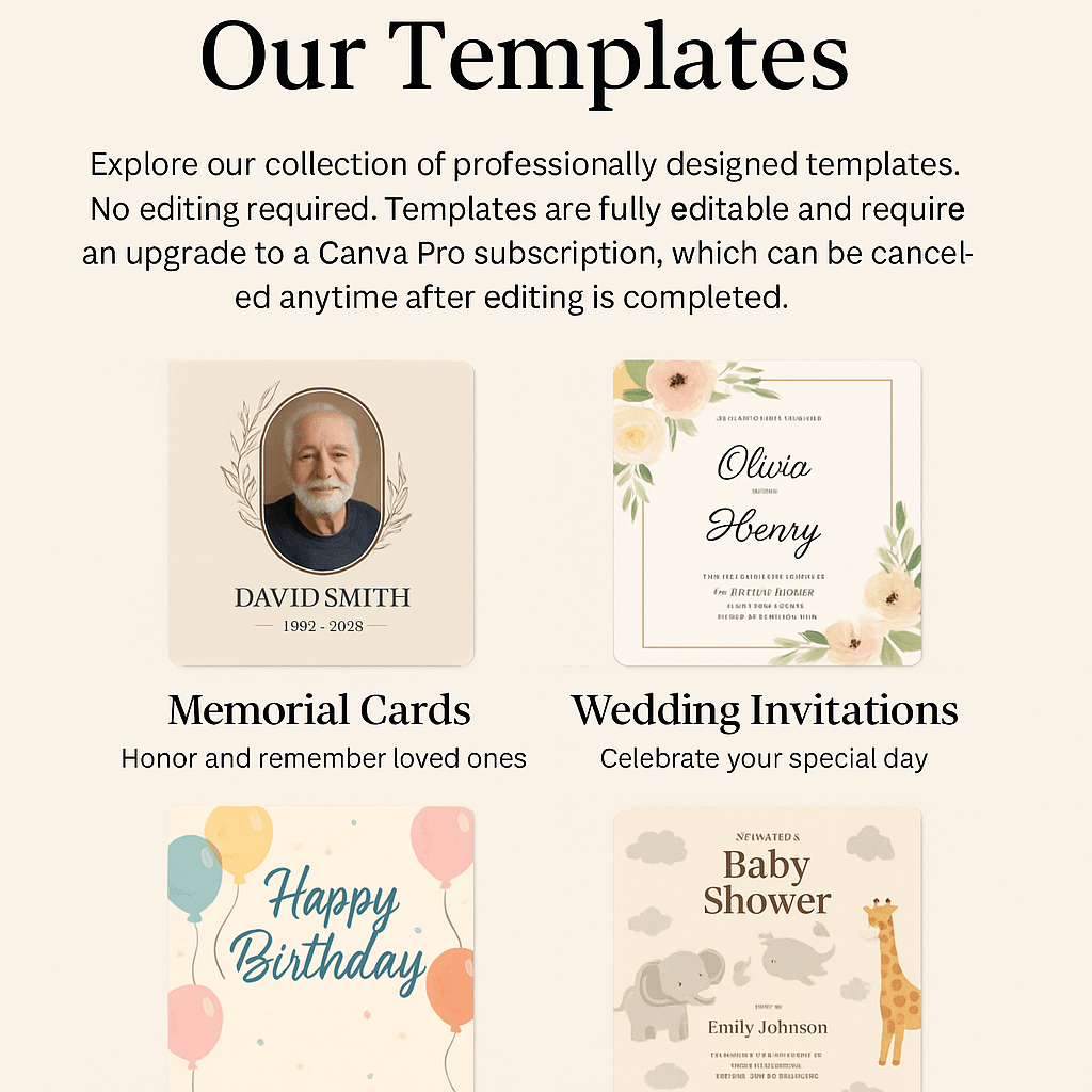 Discover professionally designed templates to save you time and impress your audience. Whether you need memorial cards, invitations, or social media designs – these templates are fully customizable in Canva.